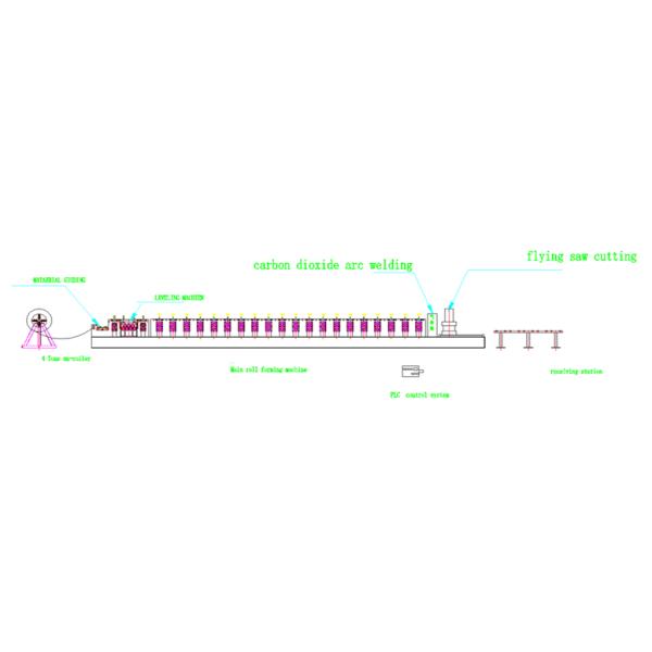 Decoiler → Feeding Guide → Leveling → Main Roll Forming → Carbon Dioxide Arc Welding → Flyign Saw